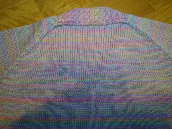 | トップダウンのカーディガンです。 前たてがつれると思ったのですが、アイロンで収まってくれたので編み直ししなくてすみました。家で着る用なので、着丈は長めに、袖丈は肘が隠れるくらいの短めに。ボタンはレースっぽいデザインでピンク色のかわいいボタンを使いました。 |