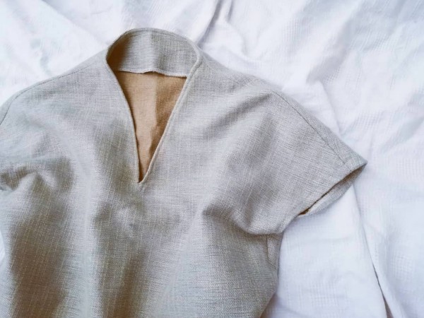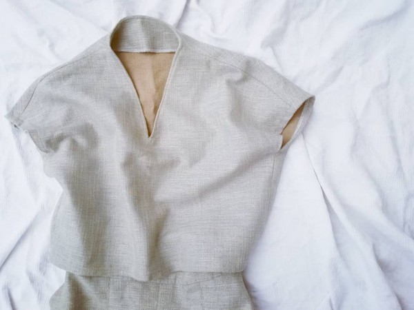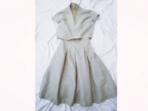 | ツイードのような分厚い生地で作ったセットアップ。スカートはタックを大きくとったのでふわっと広がります。ウエストがもたつかないように押さえのステッチを長めに入れました。 トップスはそのままストンと楽ちんに着られます。でも着たときにスッキリ見えるように裾はギリギリまで幅を狭めました。丈も短めです。肩の落ち具合や衿の立ち上がりなど、試着を繰り返して自分のからだに合った型紙をつくりました。 |