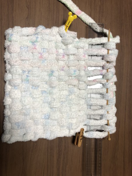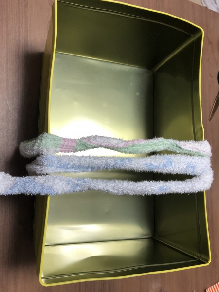 | 使い古しのタオルを織ります。まずは細く切って四つ折りにして縫う。紐状になったら、空き缶(鳩サブレ)にぐるぐる巻きつけて、織っていきます。バスタオル4枚程度準備してますのであるだけ編みます。端はバイヤスで包んで、マットができる予定。パステル調のタオルを集めたので、ふんわり仕上がると思う。 | |