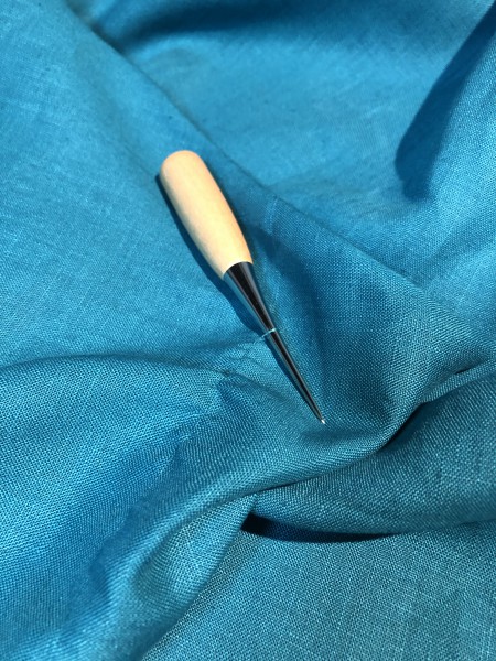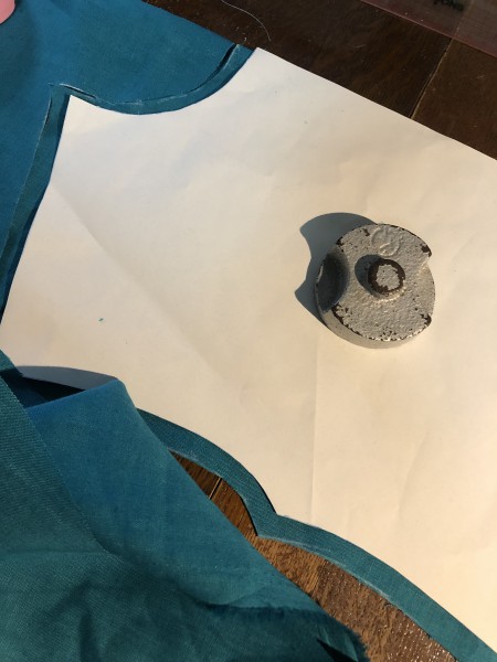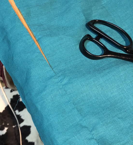 今回は麻の生地を使います。仕上がりがキレイな形になるように地直しから。全体にアイロンをかけたら、生地の端の糸を1本抜いて、正しい生地の端を裁断します。と、先生から。なるほどー。