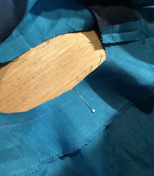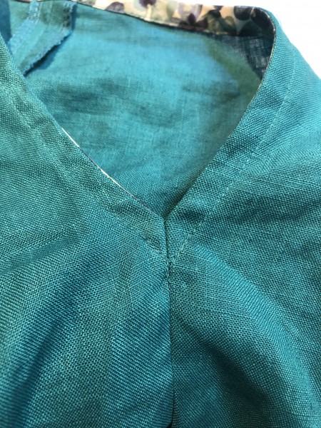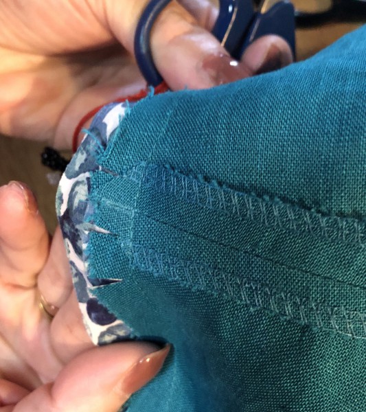 袖ぐりを縫います。カーブに切り込みを入れて、肩の縫い代は斜めにカット。