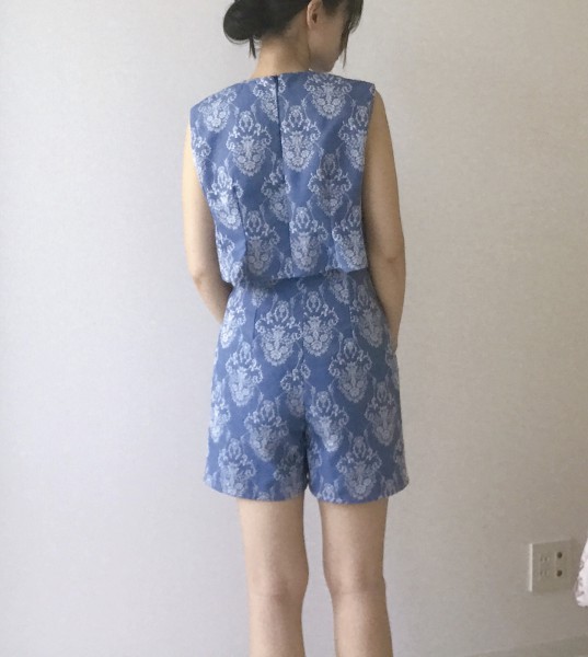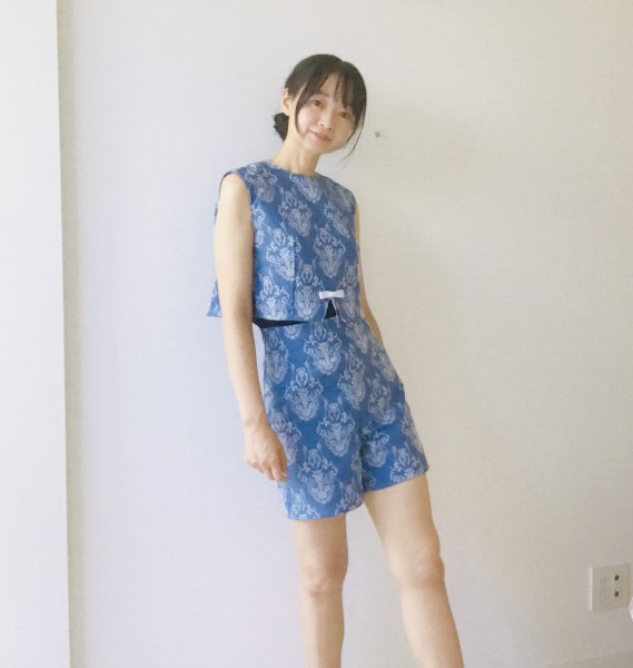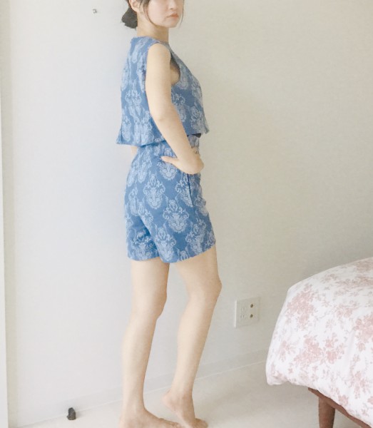ウエストまでのショート丈のトップスとハイウエストのショートパンツ