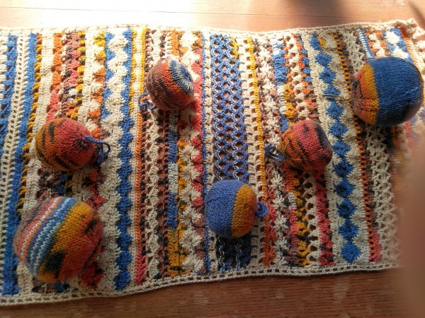 秋色(クリスマス?)ボールです。ショートピッチの部分はメリヤス編みのほうが映えますね。