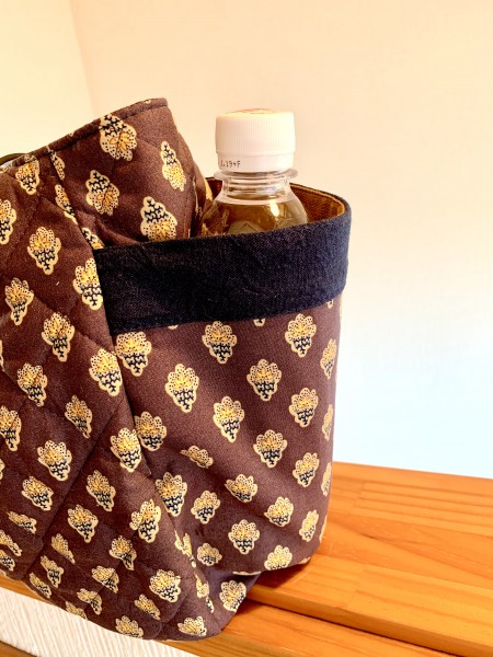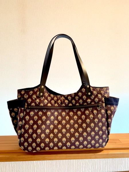 内側の色配置を考えました。外側ポケットの口部分にはキルトではなく同柄のシーチング使用。飾り生地をしましたが、目的はしっかり口が開くようにするためとメリハリを出すためです。黒に見えますが紺です。