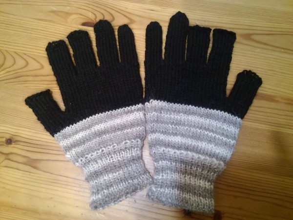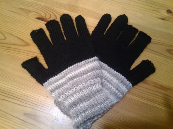 | スキニ編ム手袋の3つめです。薬指と小指以外の指3本は出せるように、先を開けました。あと、手首にかけて目を減らしてあります。 糸は手元の、1玉に満たない半端な残り糸を使いました。今までなら「いつか編むブランケットに…」と溜め込まれていたはずが、わりとすぐ日の目を見ることになりました。 |