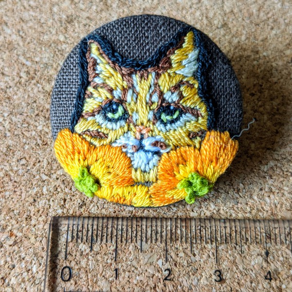 | 実家の猫をモデルに、オレンジのポピーの花を嗅ぐ猫のくるみボタン。 刺しゅう糸の色が足りない…、猫のボディと花の色をもっとコントラストつけたかった。猫のメインカラーはもっとベージュ寄りの薄茶が良かった…。 ボタン本体はフリマで手に入れた子ども用のくるみボタンアクセサリー作成キット。ブローチにもヘアゴムにもできるらしい。今は販売していない様子。 |