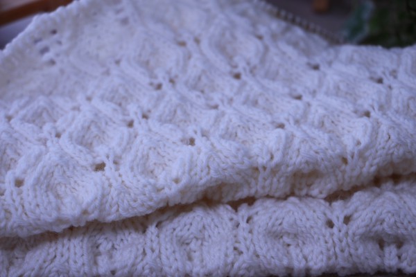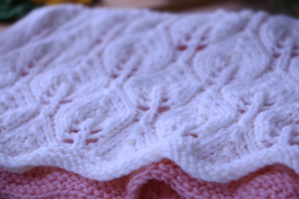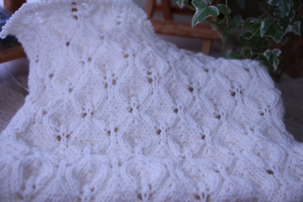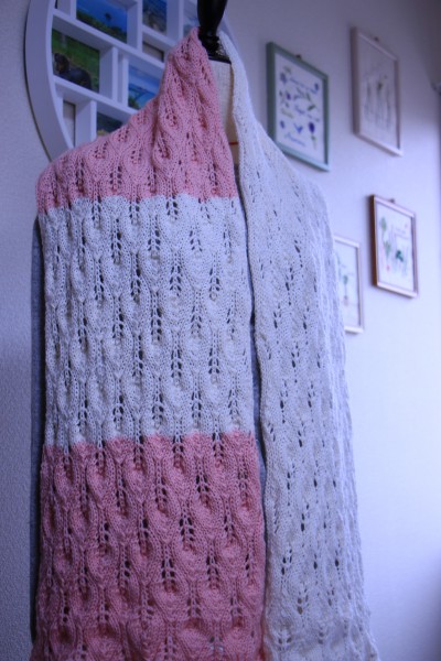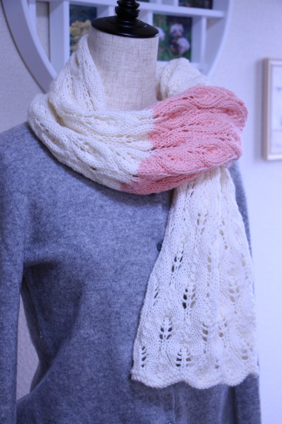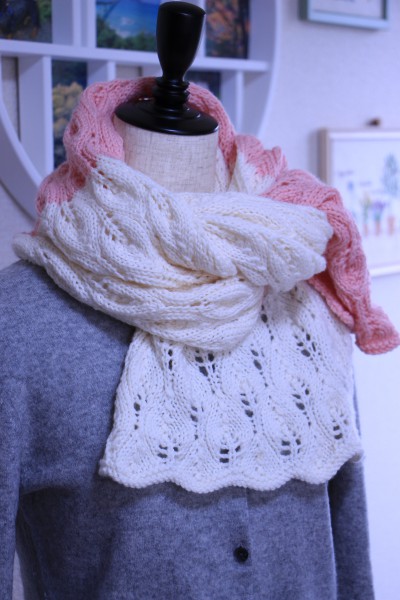 | リーフ模様のマフラーが、完成しました~(^O^) 白い糸が足りなくなったので、ピンク色をアシメントリーに配色しています。 長さがたっぷりあるので、いろいろな巻き方ができそうです。 |