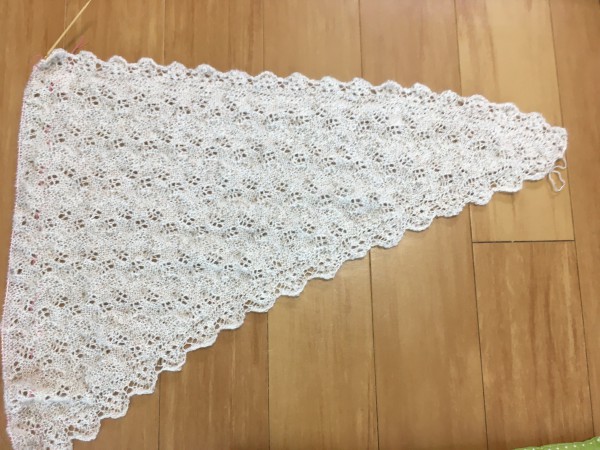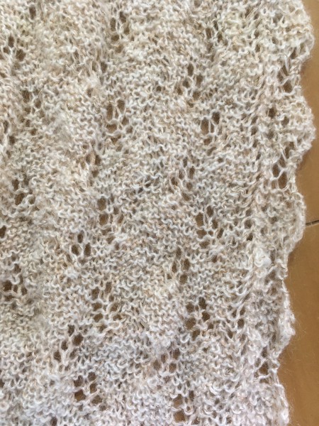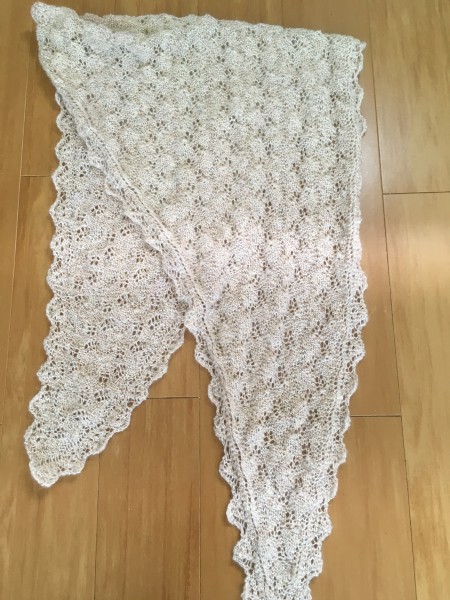| モヘヤの毛糸でシェットランド・レースの三角ショールを編みます 嶋田俊之さんの「シェットランド・レース」を参考に編みました 華やかさも出したくて、ベージュのシルバーラメ入りの極細糸を引き揃えて編んでいます |