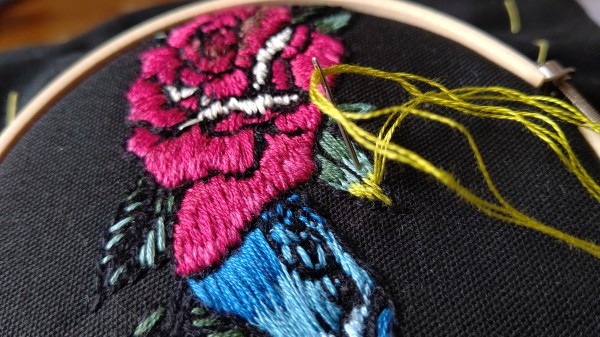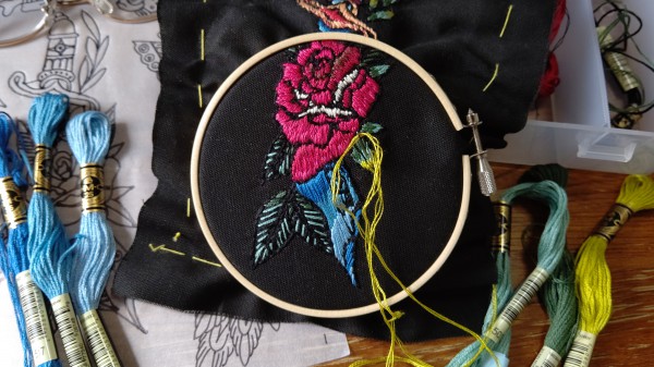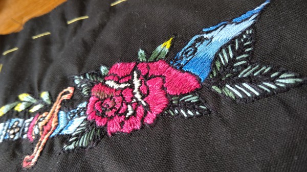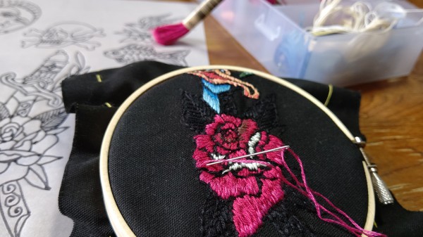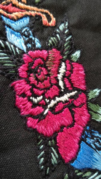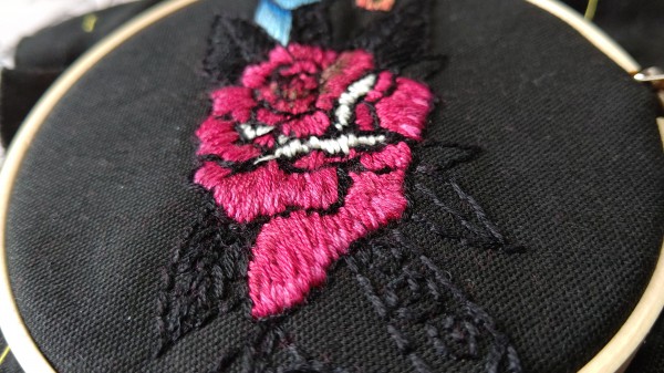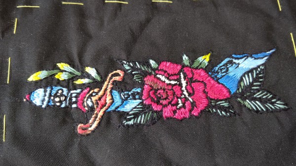 バックのポイントにする刺繍を刺しているところ。薔薇と刀の図案。
