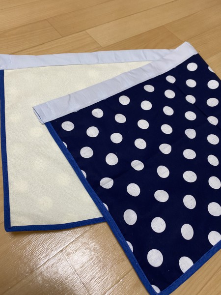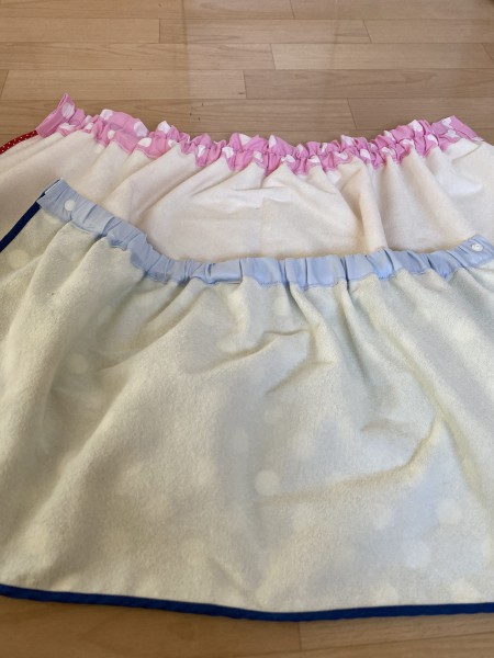 | おねしょケットです^ ^ 市販のものはスカートタイプが多いのですが、乾きにくそうなのでラップタオルのようにしました。 小さいほうはゴムをつけてまくれ防止。 バイアステープが上手く縫えず、出来上がりはいまいちでしたが、ずっと眠っていた防水シートがやっと使えたのでとりあえず満足です。 |