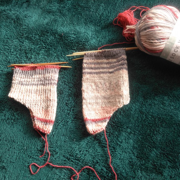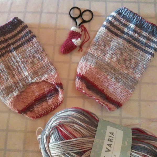 | フットカバーの足首から上を編んで止めつけたら暖かくて靴も履きやすいのでは?と思いつきました。 片方編んだ時点で色出しや編み方を変えたり(4枚目) 仮縫いまでやったところで(3枚目) 縫い止めないほうがずっと使いやすいことに気づきました。 筒形のアンクルウォーマーよりずっと暖かいし、靴の上にベロを出すとブーツっぽくなります。 薄いほうが好みなので履くくつ下は編まないのですが、 使わなかった赤い糸で「かかと」と「つま先」のあるミニくつ下を編みました。 |