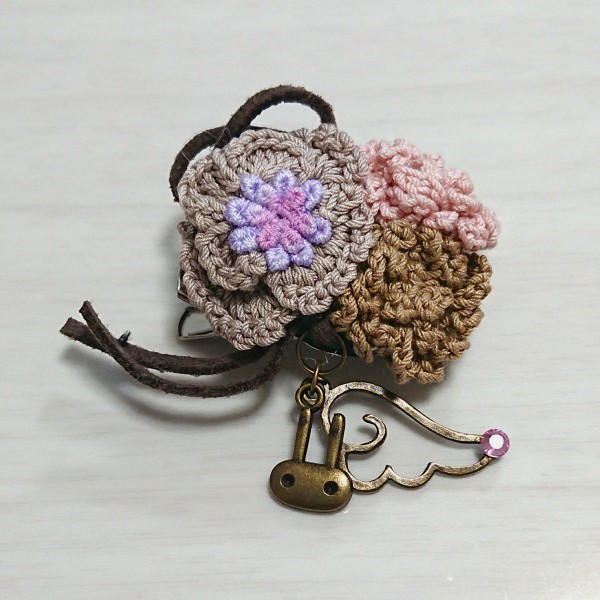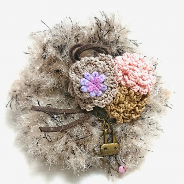 | ファーヤーンのシュシュとお花の2wayピンです。 シュシュに合う飾りを考えていて、以前作ったブローチを思い出しました。 服に合わせにくくて出番がなかったのですが、ふわふわのシュシュに合わせてみたら使えそうだったのでセットにしました。 |