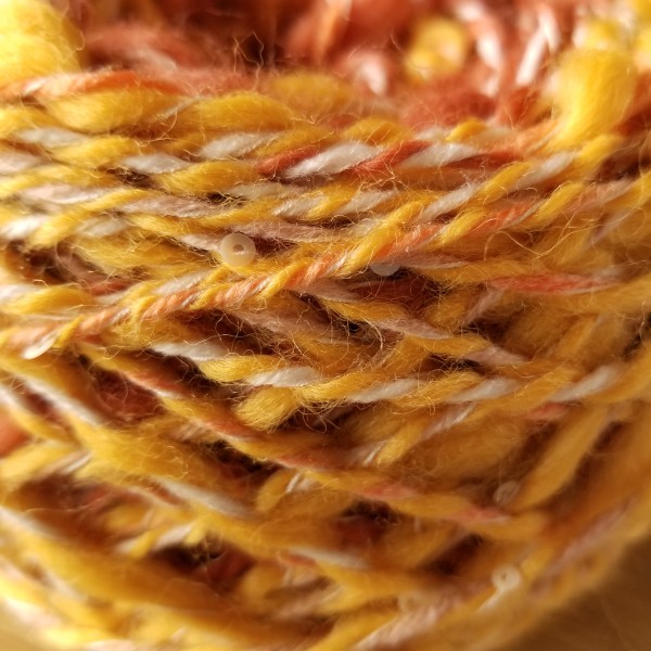 自分で紡いだストレートヤーンとアートヤーンで編みました。