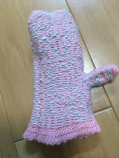 | 子供用ミトンです 桜の模様を編み込みました 子供がわたり糸を引っかけないように、こmqかく編み込んでいます |