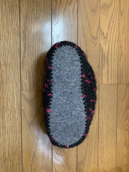 | 毛糸在庫消化を兼ねてルームシューズ。 糸の量が少なめだったので市販のフェルト靴底で節約しました。 基本は中長編み、甲の部分だけ細編み。 |