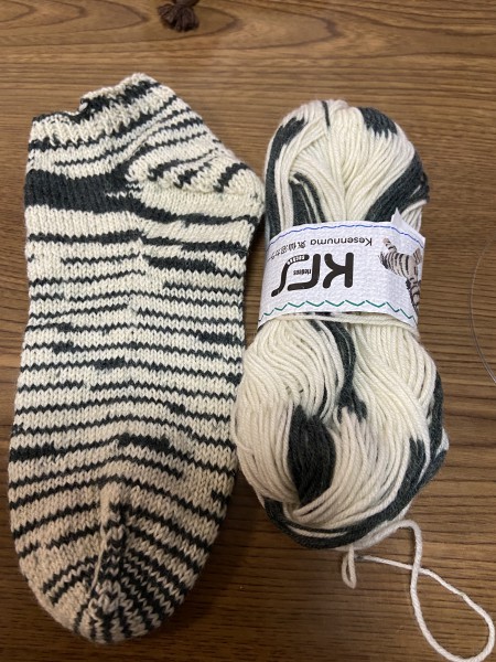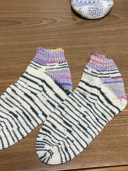 糸が足りなくなってほどいてかかとと履き口を別糸で作り直しました。