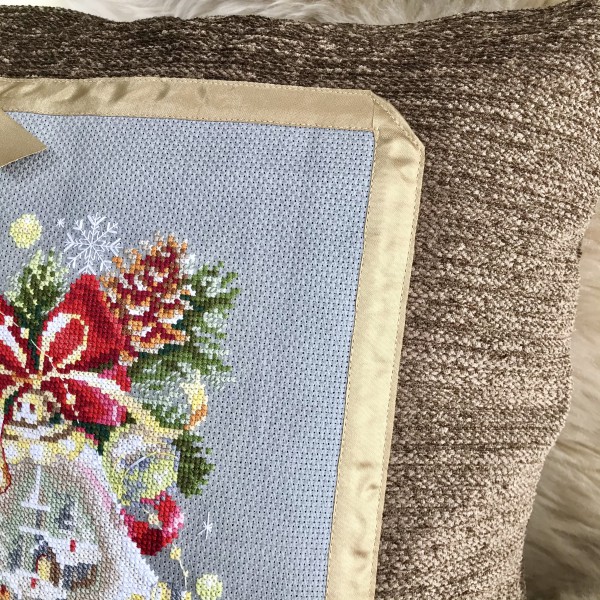 クッションカバーに縫い付け、周りをリボンで囲みました。