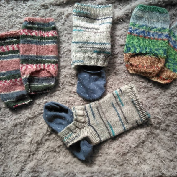 | 母に作ったリストウォーマーが返品されたので(;_; アンクルウォーマーに編み直ししました。(真ん中のグレー) 何かでみかけたトレンカ型。ずれなくて使いやすいです。 いろんな残り糸でウォーマーを作りましたが、この糸は手頃で使いやすいと思います。 気を良くして、セーター風のネックウォーマーも作りました。 色もかわいくて成功!と思ったのですが 水通ししたら襟ぐりが伸びました。 のどもとが寒い(´・ω・`) こちらは針を細くしてやり直します。 |