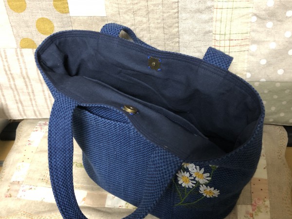 作務衣のリフォーム。前見頃のポケットを外ポケットとして利用しました。カモミールの花をリボン刺繍しました。
