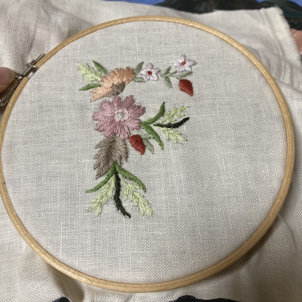 サテン刺繍でお花モチーフでイニシャルを刺繍しました。