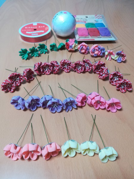 | 髪飾りを作って余った生地を使い切ろうとボールブーケを作ってみることにしました! | |