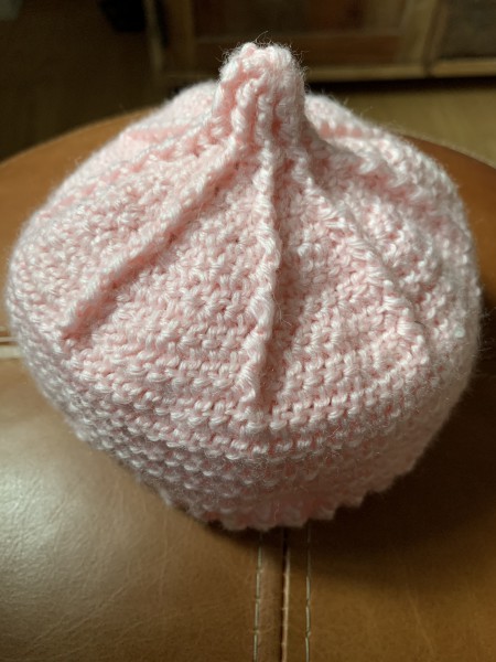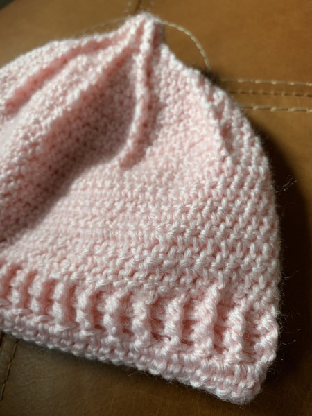 ベビーのどんぐり帽です。「オーガニックコットンで編む赤ちゃんニット」に掲載されているものです。間違えて裏目が表になるように編んでしまいましたが、かわいくできました。