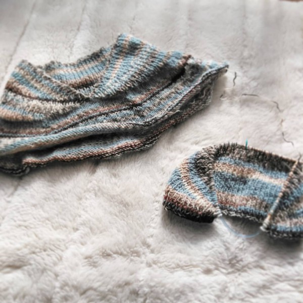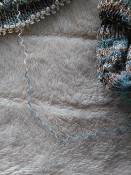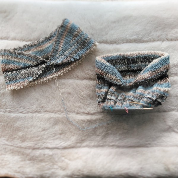 | トップダウンでへちまえりのセーターのようなネックウォーマーを作りました。 色も形も気に入ったのですが、水通ししたら襟ぐりが伸びました。 ネックが暖まらない(T_T) 針を落として、やり直ししてます。 襟のデザインを変えるか迷いましたが、今回はサイズダウンだけにしました。 分散増し目も自分の好きなバランスが分かってきました。 作りながら別のアイディアが浮かんだので、お正月に試してみたいです。 |