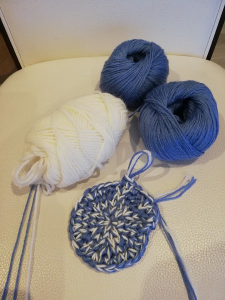 セリアのカラーパレット中細(青)2本とニューベビー(白)1本を引き合わせて作ります。円をメリヤス風で編んでいきます。かぎ針は7号。今日は5段目まで。