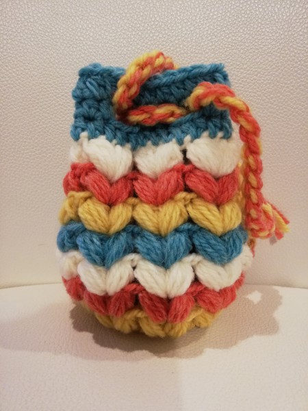 | YouTubeで見たモコタロウさんのハートだらけの巾着ポーチを作ります。 甘くなりすぎないよう 青と白の毛糸にします。 と思いきや、途中で変更しました。 最初の毛糸は、ハートがヨレヨレになってしまい、練習のつもりで余った毛糸でつくったら、案外いい感じ☆これで完成とします。 青と白の毛糸の組み合わせもかなり私好みなので、別のものを作ろうと思います。 ○側面 玉編みでハート7段 片側4回 ○上部 中長編み3段 紐を通す穴を付けました。 ○底 丸底 こま編み 往復編み5段 ○巾着の紐 2本取りくさり編み |
