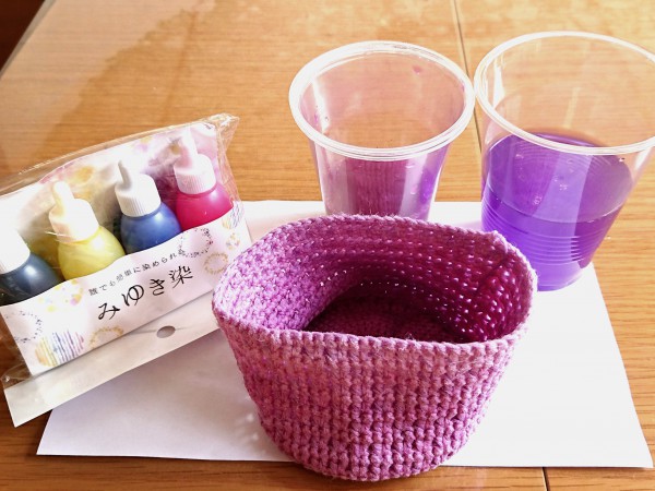 みゆき染めで染めました。青が強すぎて紫になってしまいましたがOKということにして、乾くのを待ちます。