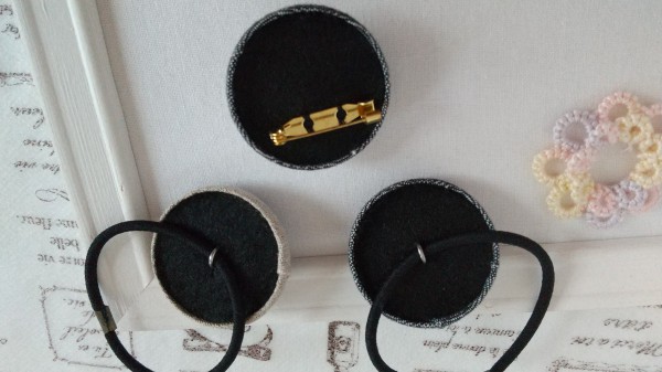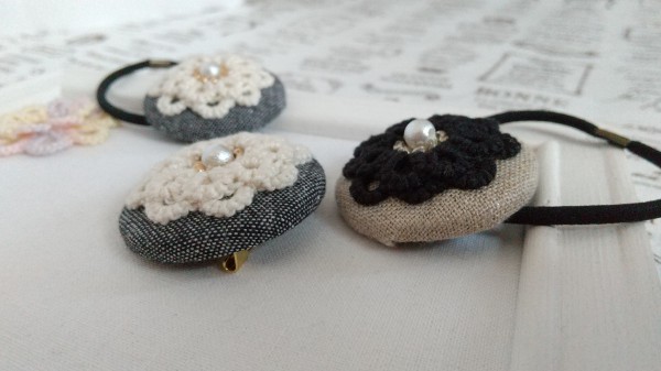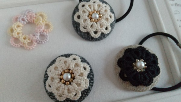 以前アップしたブローチに使用したタティングレースと同じモチーフですが、こちらはくるみボタンに加工してヘアゴムとブローチにしました。