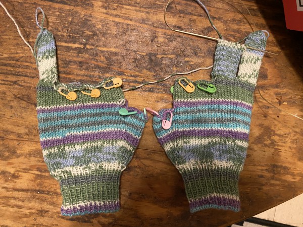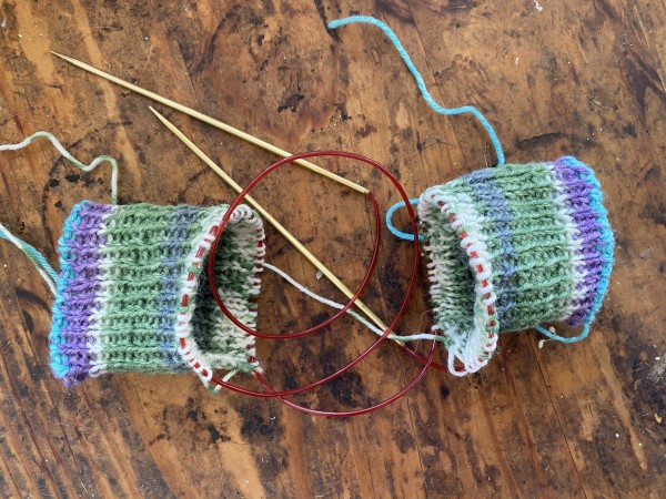 同じものを2回作るのを嫌っている私なので、一本の輪針の上に左右同時に乗っけて編んでいきます。