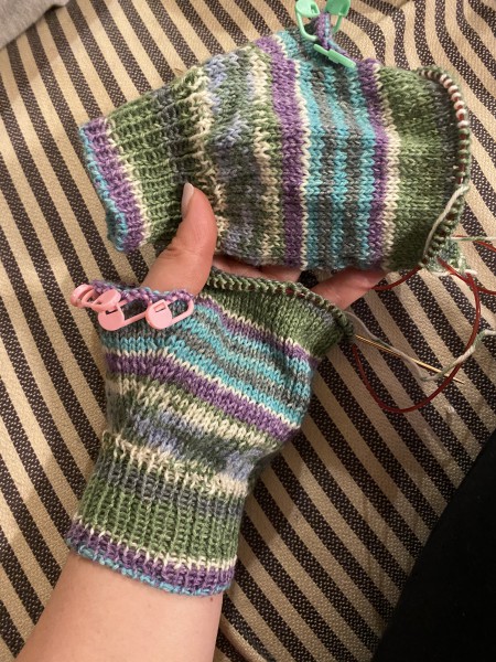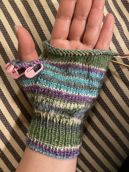 この写真でお気付きかもしれませんが、指は輪で編まずに2本針で袋編みにて作成しています。