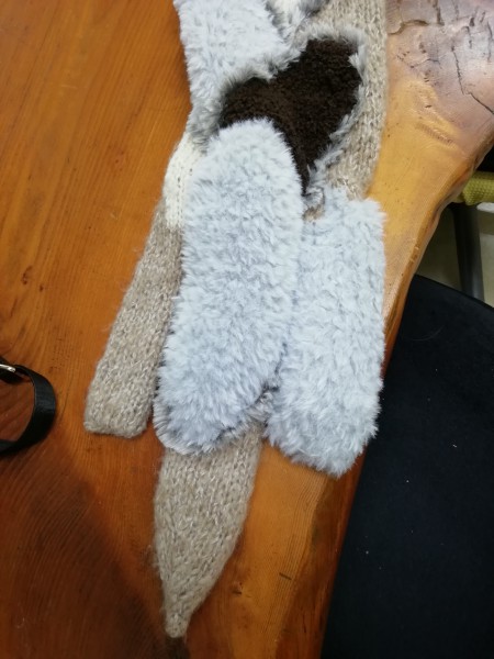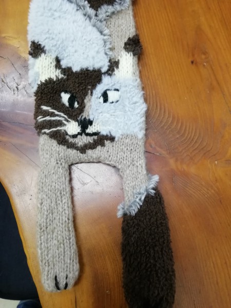 | 知人に頼まれて編んだ過去の作品です。 猫の目とひげは刺繍です。 手足は別に編んでメリヤスはぎしています。 筒状なので、糸始末が楽で、基本的にはメリヤス編みなのでサクサク編めます。 ちょうど良い太さの針がなく(10号、12号は有りましたが。)、ふと思い付き某コンビニで貰った箸を計ったら11号だったので、先を削って頭にゴムキャップを付けて全て箸で編みました。 今もこの箸は道具箱に入っています。 受け取った知人はとても喜んでくれたのですが、コンビニの箸で編んだとは言えませんでした。 糸はほとんど100均で揃えました。 |