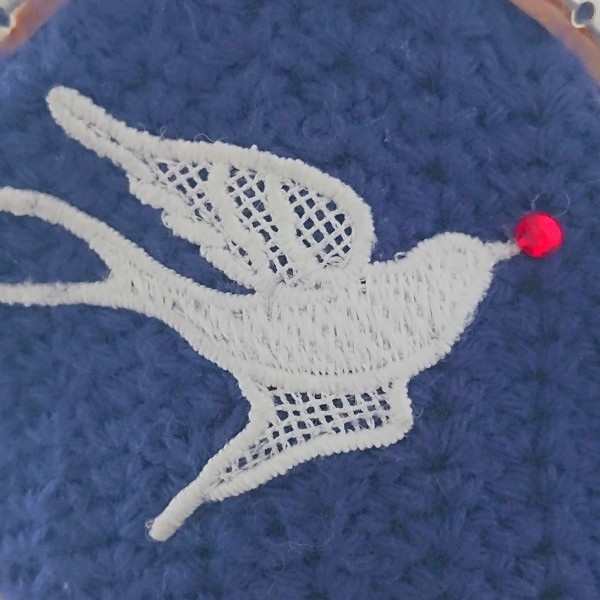 | 縫い付けタイプのがま口です。 鳥のもチーフを付け、「幸福の王子」のイメージで赤いラインストーンを足しました。 模様編みが一部間違えていました。口金を付けてから気づいたのでそのままです。 縫い付けもバランスが悪くて歪んでしまいました。 次はもっと丁寧に作ります。 |