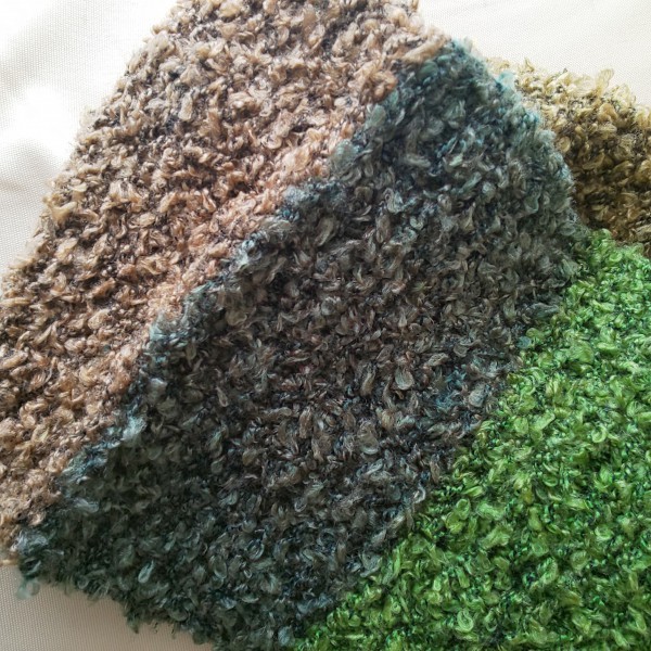 ポコポコとした糸で、グラデーションで色が変わっていく糸を使って編みました。くるっとひねってはいでます。