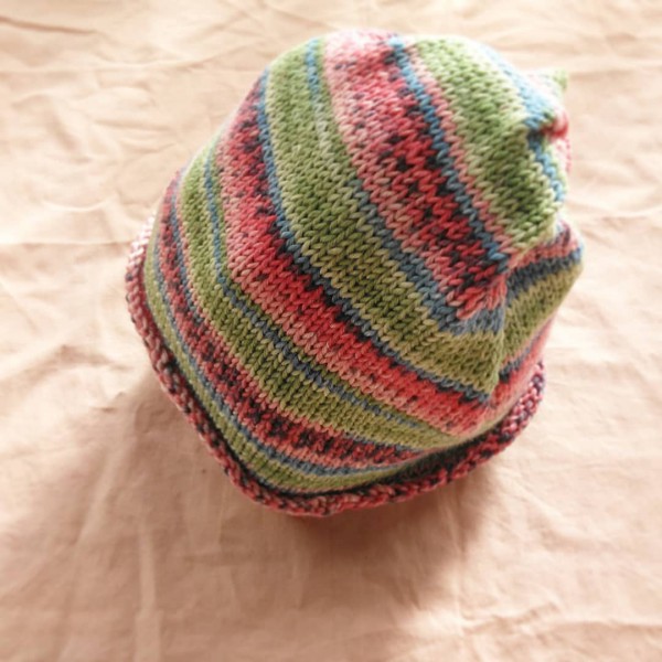 | 梅村マルティナさんの腹巻帽子を自分なりにアレンジして作りました。 アレンジしたのは 内側の編地も外側にくるんとなるように、裏表を反転させたこと。 太い糸を使ったので、きれいにねじることができるように、細糸てゴム編みを挟んだこと、です。 糸を変えてまた作ってみたいです。 |
