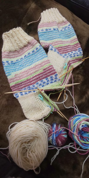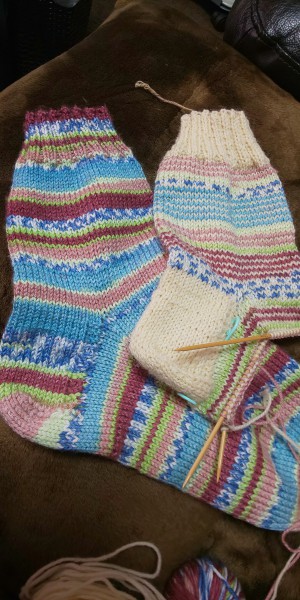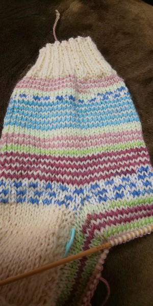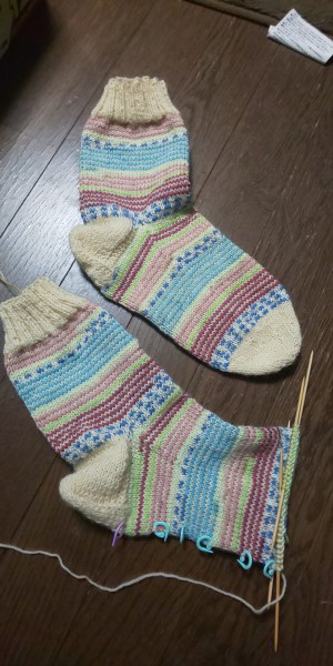 残り糸が足りなかったら、他の糸を追加しようと思っているので、柄合わせしながら両足編んでいます。