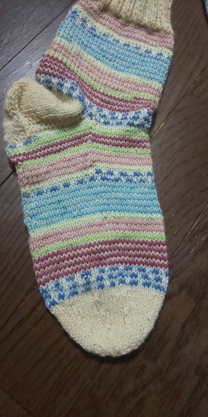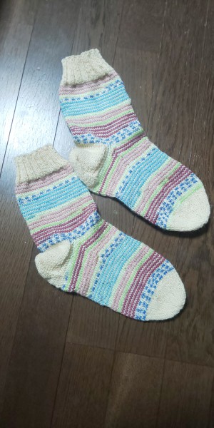 夫に、洗い替えにまた靴下を作ってほしいと言われ、前回の残り糸に他の糸を足して作ることにしました。