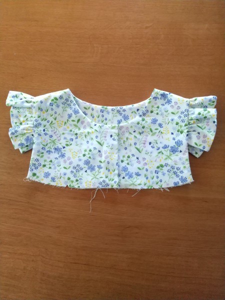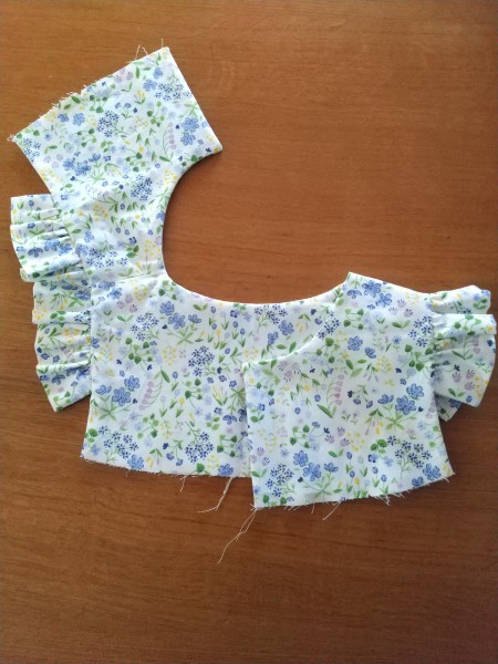 身頃の肩を縫い合わせ、フリルにギャザーを寄せて身頃に仮縫いしました。