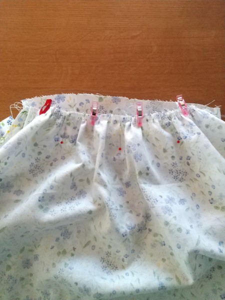 スカートにギャザーを寄せて、身頃と縫い合わせます。