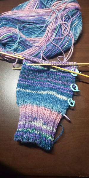 案の定手の甲と親指で糸が足りなくなったので、福袋で買ったHundertwassers24色の中から、似た色が入っていた3203で続きを編んでいます。