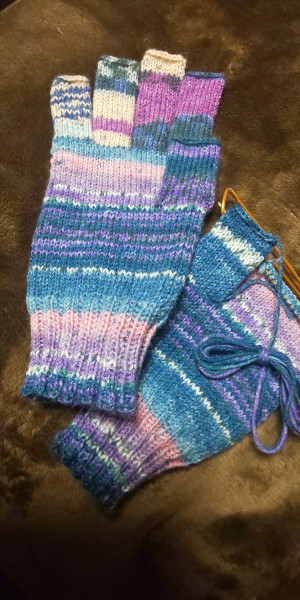 毛糸が足りなくなったら、指の色を変えるか、私のハンドウォーマーにして、夫には新しい毛糸で作るかしようかなと思っています。