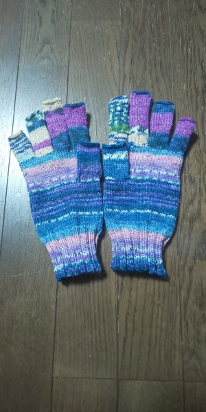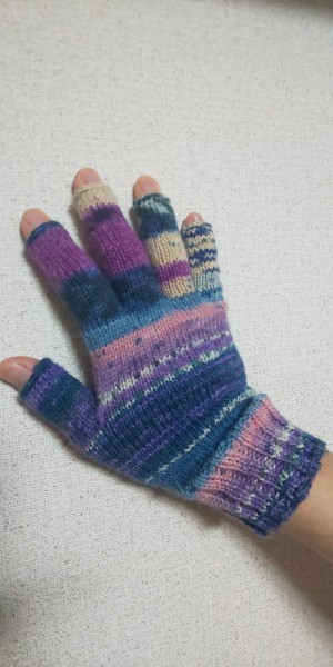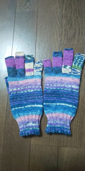 これは初めて作った手袋で、夫のリクエストで一本一本指先の出る長さを調整して作りました。
