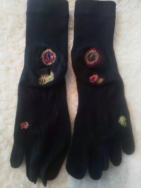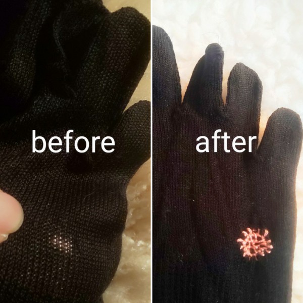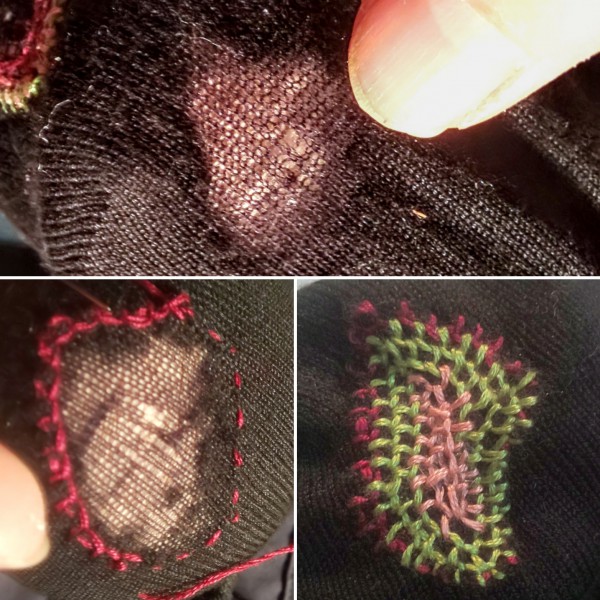 傷みのひどいところは、裏から布をあてて、その他はブランケットステッチで。