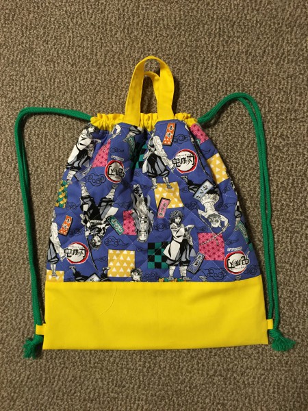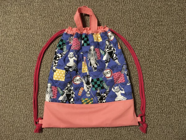 いただいた大人気の鬼滅のキルティング生地でナップサック作りました。