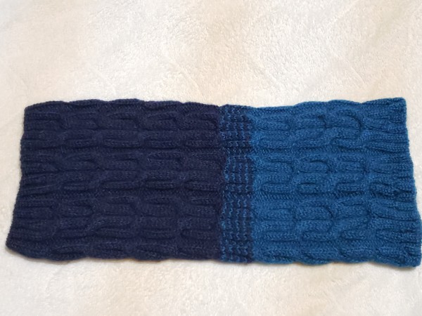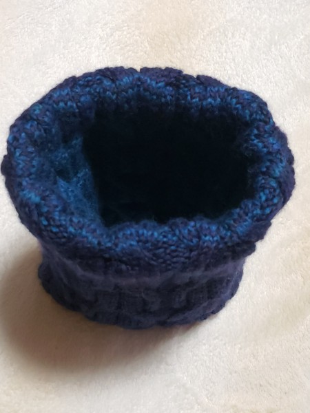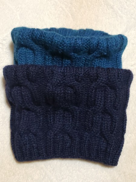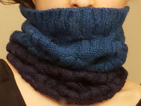 | 【 リバーシブルに使えるツートンColorのカウル】 とても手触りの良い「原毛に近いメリノウール」という毛糸に出会い、チクチクしなさそうなので首もとに。 濃紺とピーコックブルーで、作業着の青にも合うカウルを。 |