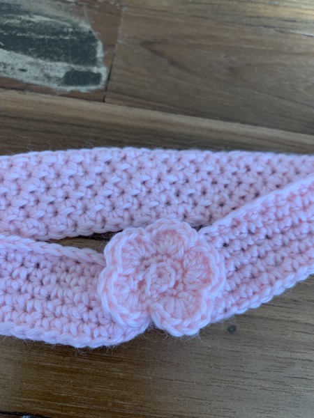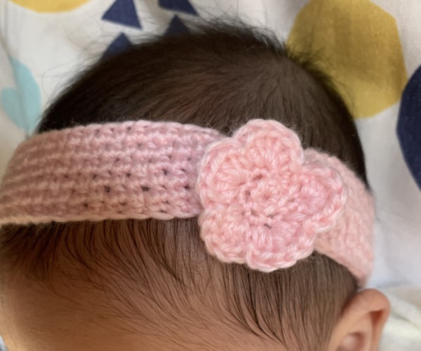 ベビーのヘアバンドです。春らしいピンクで作りました。飾りにお花をつけて。