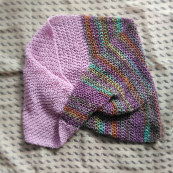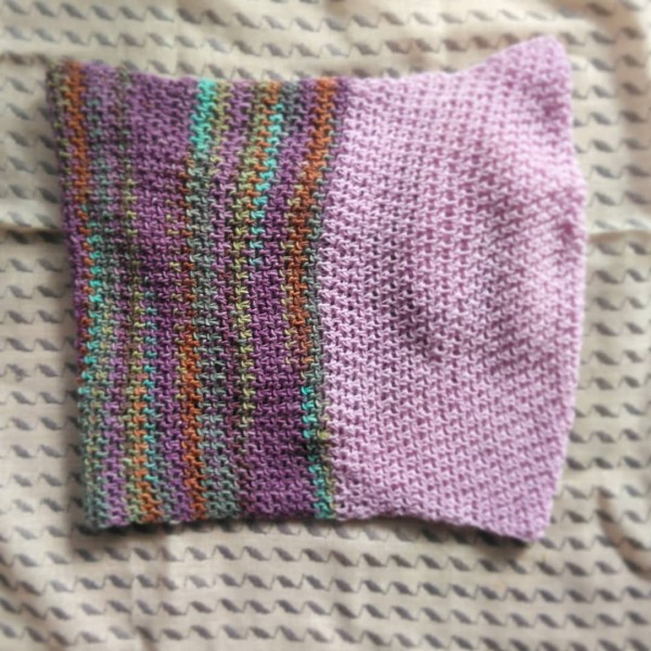| ストレッチ編み 単色と段染めで編み方を変えて見ましたが、ぱっと見には違いがわかりません。 平置きすると段染めの編み方のほうが直線的です。手触りは単色のほうがふわっとしてます。それでも「なんとなく」「強いて違いを探せば」です。 よく伸びて軽いので花冷えの日には良さそうです。 |