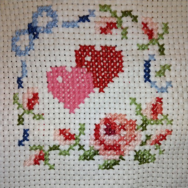 真ん中にダブルハートを刺したいとのリクエストだったので、他のキットを参考に図案をかいておいたら、自分でチクチク刺してました!
